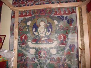 In this picture of Chenrezig (and retinue), I would learn later that Chenrezig’s consort, son and daughter are present, along with the Lords of the Five Buddha Families – Amitabha (red – above Chenrezig), Amogasiddhi (green), Vairochana (white), Akshobya (blue) and Ratnasambhava (yellow).