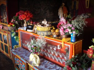 The palace had been ransacked apparently (a while back), and the thieves had cut a hole in the back of the statue’s head – hence the screen being there. Otherwise we were able to walk around the statue and the Buddha’s attendants had statues themselves in the corners – Shariputra and Maudhgalyayana. In this shrine room there were a couple of local Ladakhi’s speaking with a monk, and according to our guide, the monk was doing a divination for them.