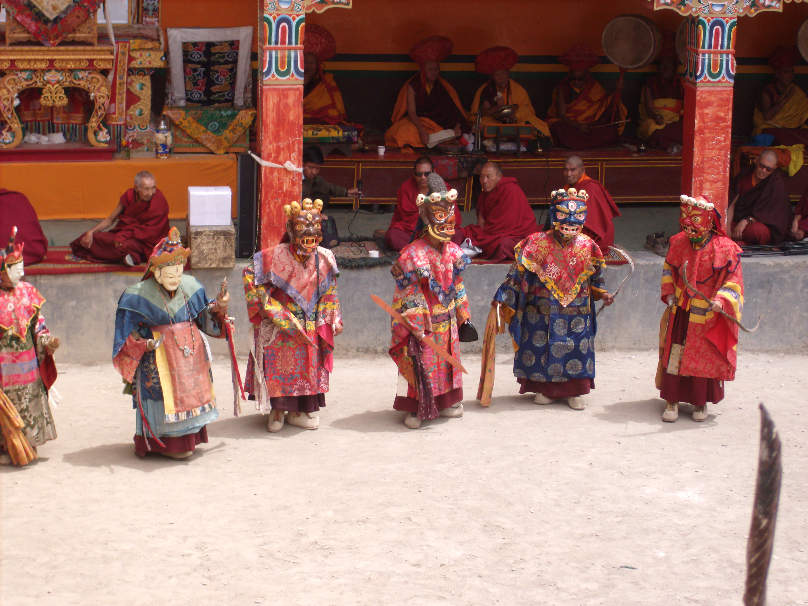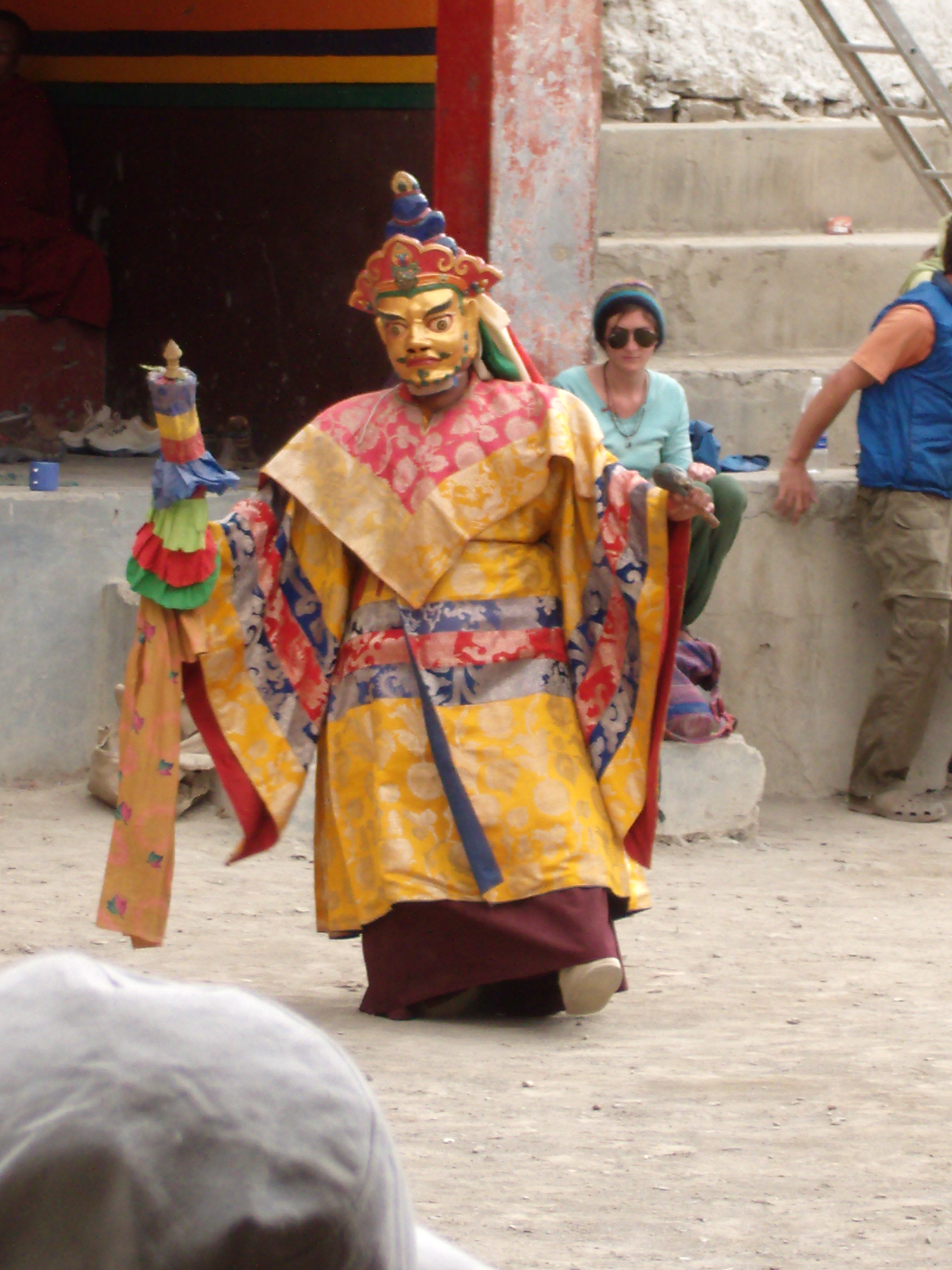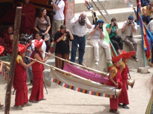 There were many people at the monastery – Westerners including us Americans, Europeans, Japanese, Tibetans, a few Indians and many local Ladakhis. Apparently the Cham dances draw large crowds – such that the major monasteries in Ladakh stagger their events so that they do not compete with each other. Also, the Cham dances used to be in the 12th Tibetan lunar month, which would be closer to early February – or in the 1st month to celebrate the New Year – still in the winter. However, observing the Cham dances is a method to obtain enlightenment (and the monks get to benefit others therefore by dancing), the dances are pretty much held in the summer in Ladakh where more people can benefit from watching. And as a large tourist draw, the monasteries profit more as well.