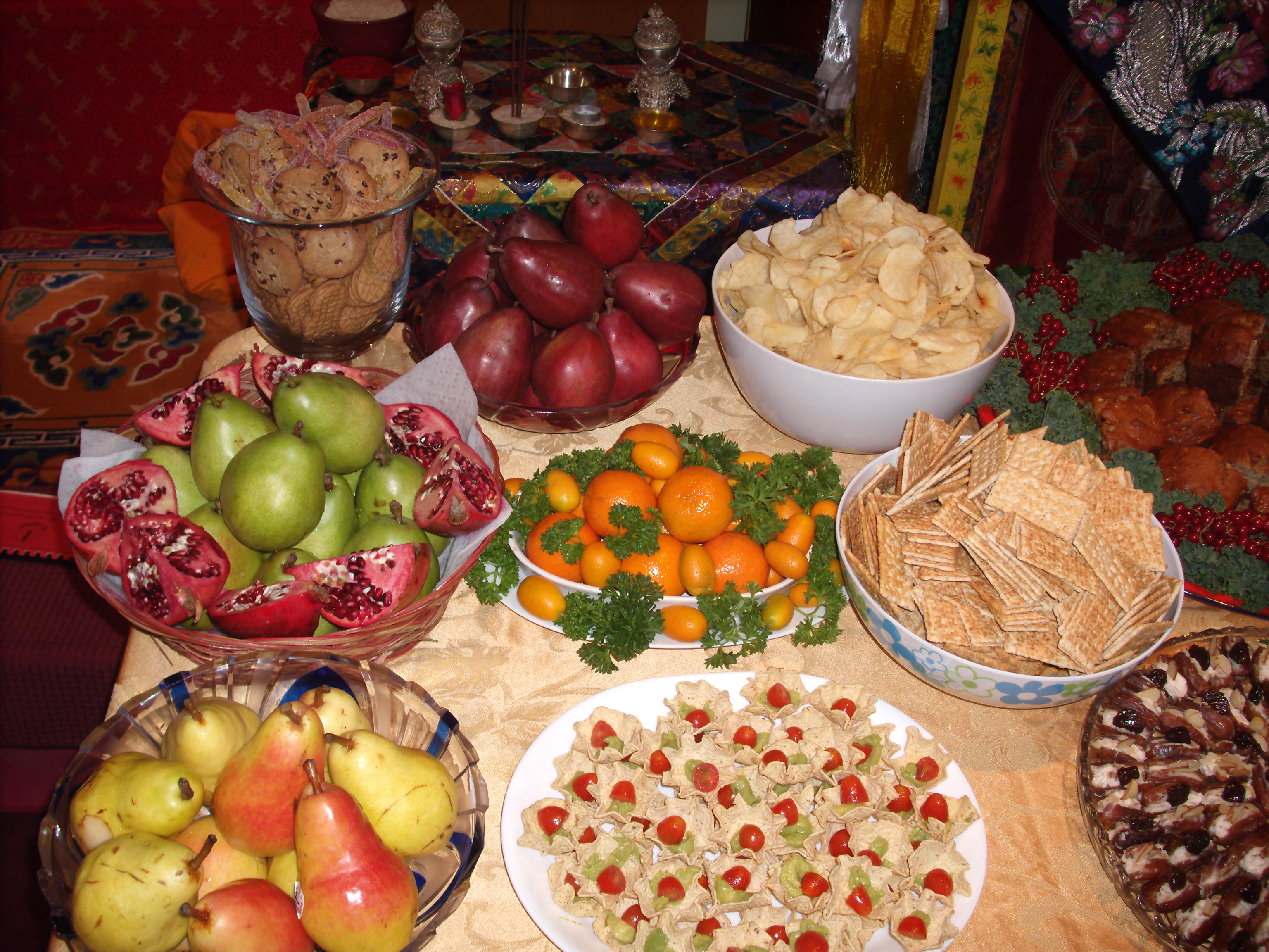 The pictures on this post are from the Lama Chopa Tsok feast on Sunday. The Lama Chopa Tsok is an offering to the wisdom beings and lineage lamas and it is offered after major retreats / religious events as a way of dedicating the merit gained during the practice. It is said that if Lama Chopa and Tsok are offered with sincerity, then the lineage lamas must attend, either in person or through the ether. This particular Tsok was particularly delicious and special (to me) because most of it was homemade and as a result, it had much less sugar than is typical (when dozens of people bring Tsok offerings on their own).