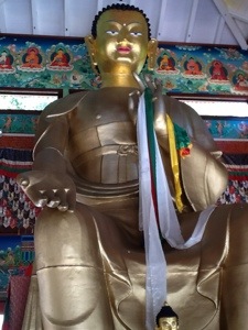 This is Samten la standing in front of the statue. Note how the statue dwarfs him. You will notice the murals of the Buddha’s life story in the background.