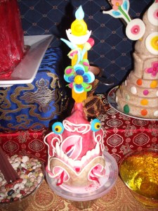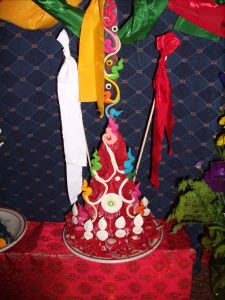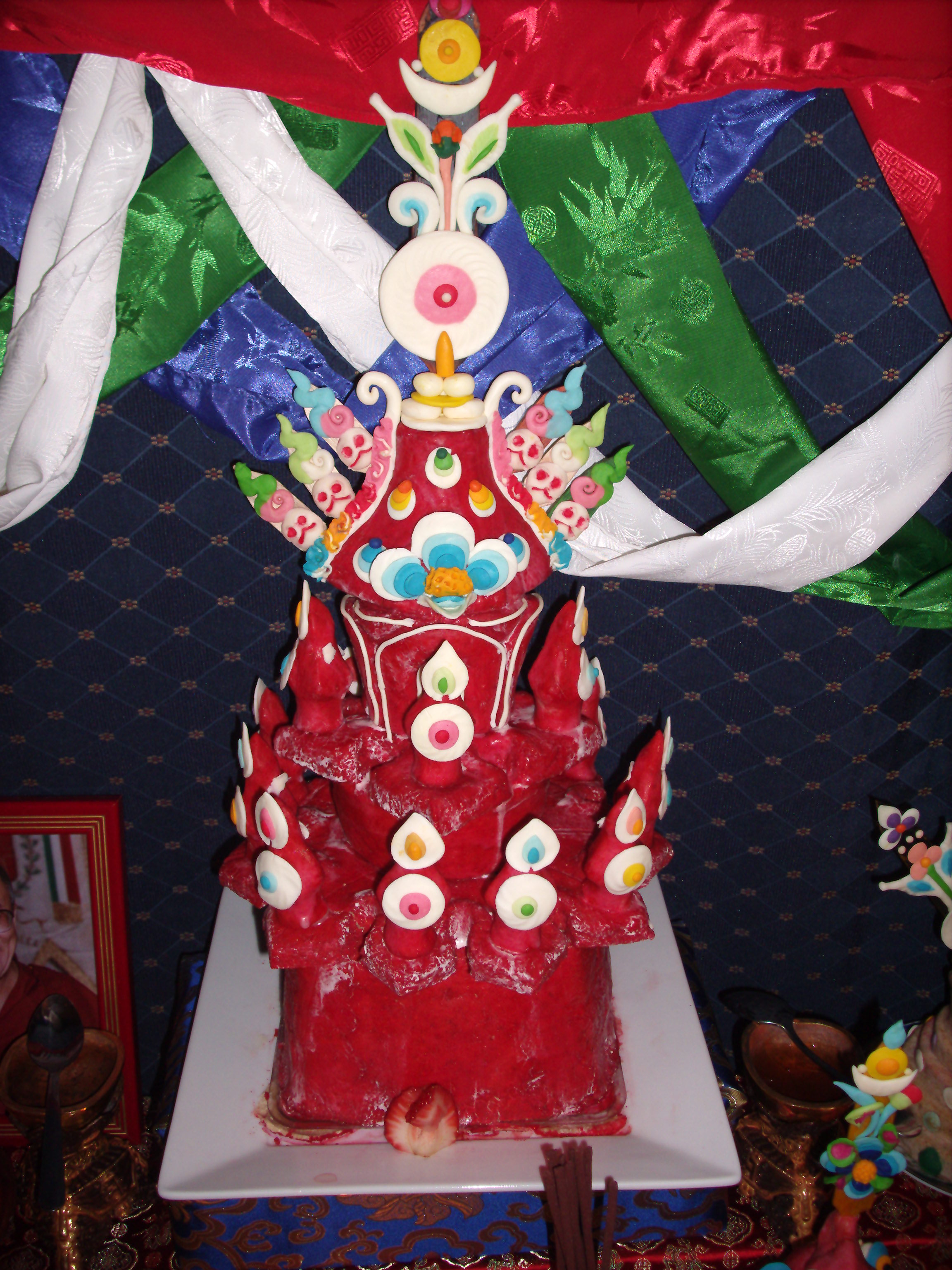 There were red roses in each of the dozen windows of the shrine room, along with fresh flowers on the mandala. Many colorful tormas, offerings, water bowls and candles also adorned the shrine / mandala. I will say more about this in the next post.