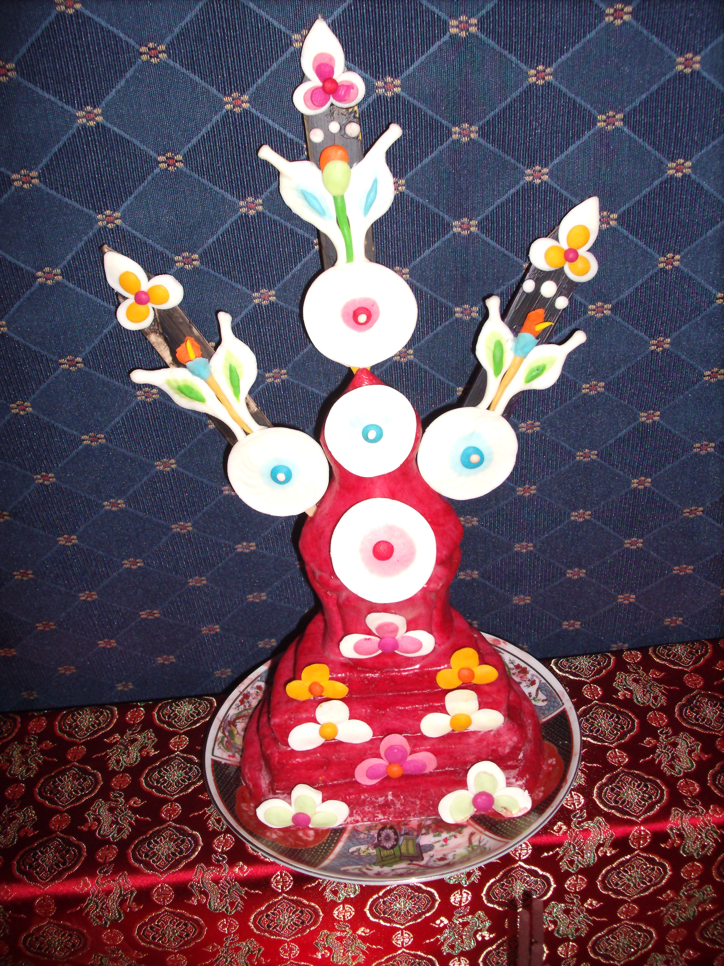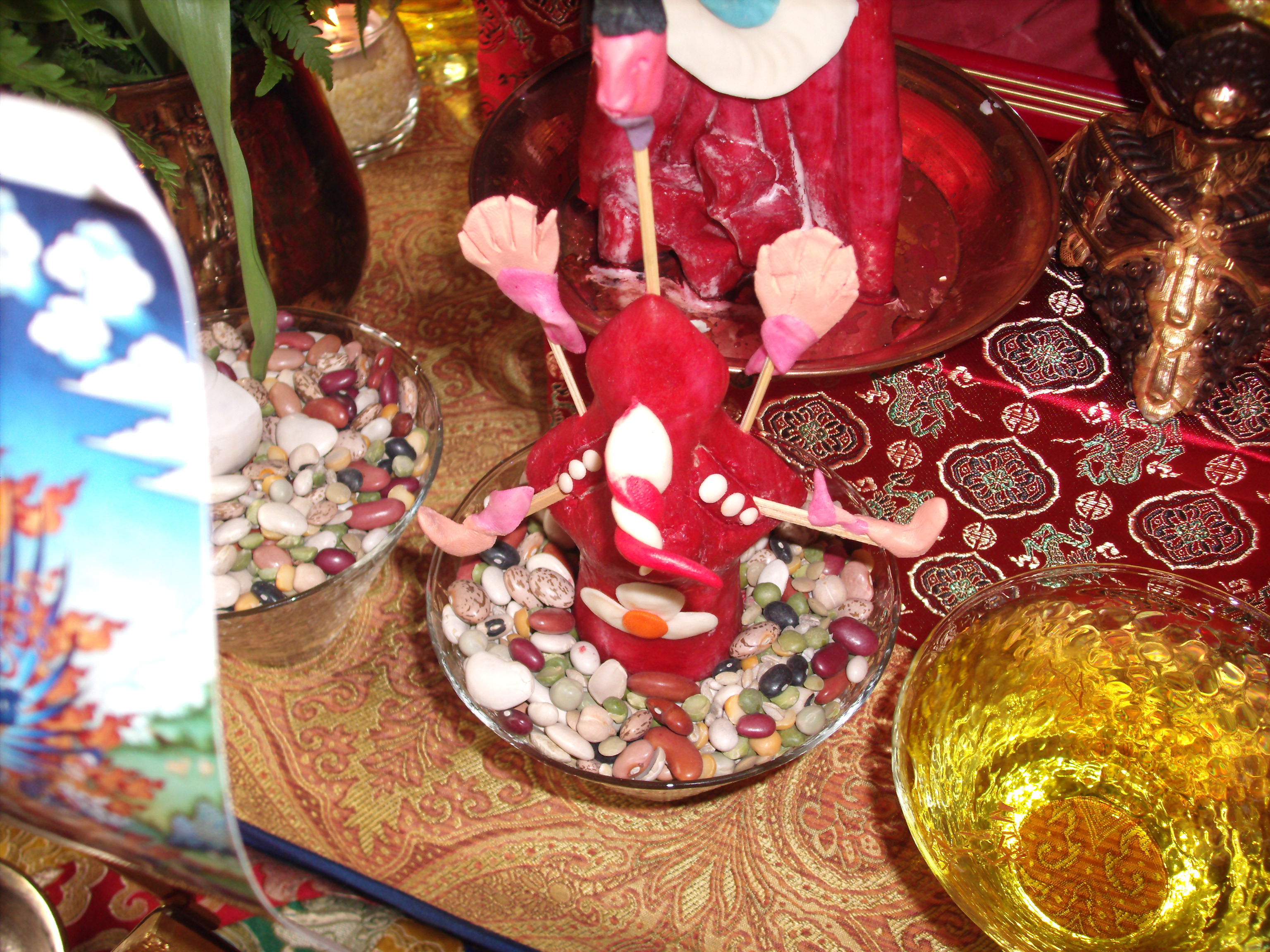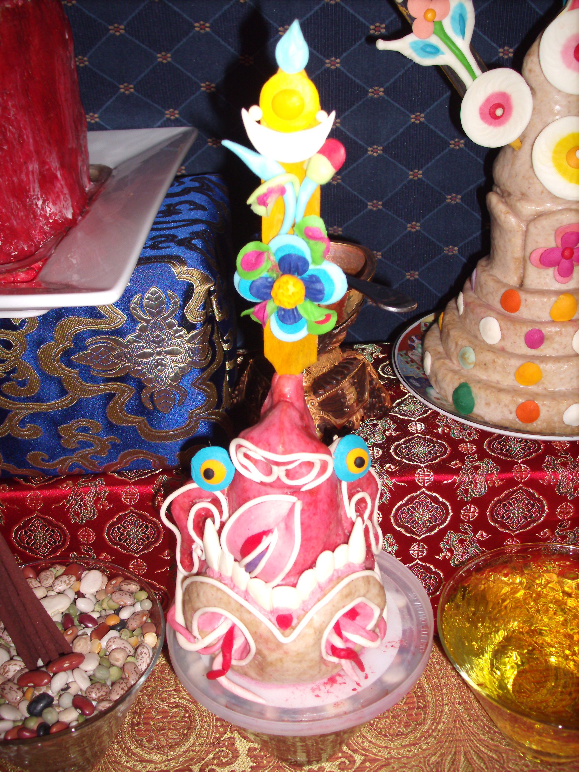 Then, Tuesday through Friday, the Drupchen structure took effect: we took shifts at night so there was always someone chanting the mantra in the shrine room. We also took turns with eating, so again there was always a continuous recitation occurring. We did a morning session from 9 – 12, an afternoon session from 2 – 5 and then an evening session from 7 – 9 pm Tues – Thurs. During these sessions, we did the same prayers with a few additions depending on whether it was the morning (where tormas were offered), afternoon or evening. After the empowerment, our numbers dropped a little, but there may have been 80 – 100 people there for Tuesdays sessions.