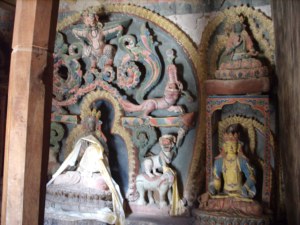 On the way back to Leh, we stopped at the Basgo Palace. This was one of the two lower palaces in its day – which judging from the look of it, was definitely decades or more likely centuries earlier. The place was quite dilapidated and only one shrine room was kept up well. One “building” was barely that – the red clay walls seemed to be melting over time, and it had been at it for a while. However.. They have been maintaining a large Maitreya statue – I wrote 40 ft in my journal but that sounds generous. It is very fascinating – the statue has windows up high so that it can gaze out across the valley. There was another bronze statue but unfortunately I did not write down who / what is it of. However, see these photos – the ceilings are very high and everything (like usual) is painted or stenciled. Very very beautiful, colorful. You can see in the first picture how Maitreya’s face is lit up by the sunlight through his windows.